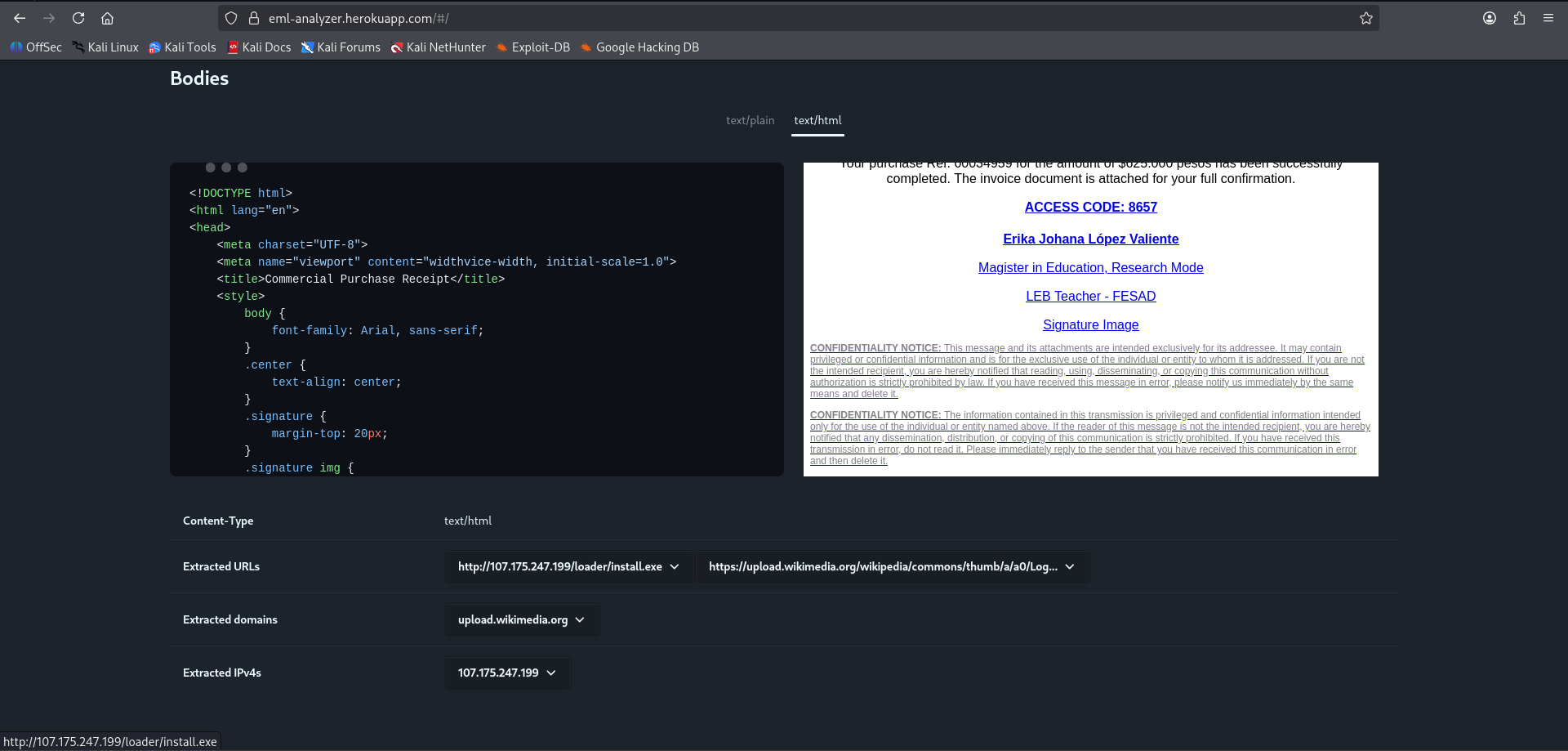 The investigation began with an .eml file analyzed using the EML Analyzer tool. The email presents itself as a “Commercial Purchase Receipt” claiming a $625,000 purchase (Ref. 00034958), designed to create urgency and compel the victim to click the malicious link.