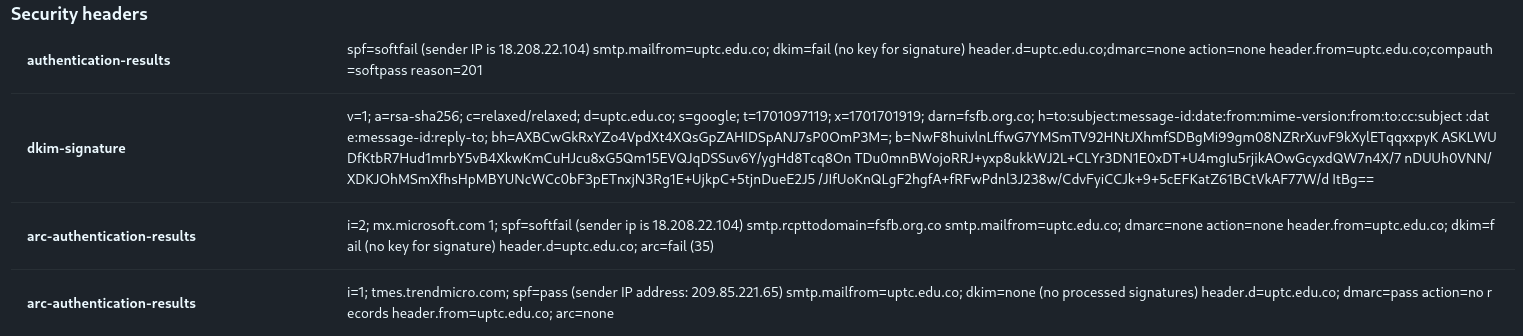 The combination of SPF softfail and DKIM fail indicates the email is spoofed—the attacker is impersonating a legitimate sender (erikajohana.lopez@uptc.edu.co) without proper authorization.