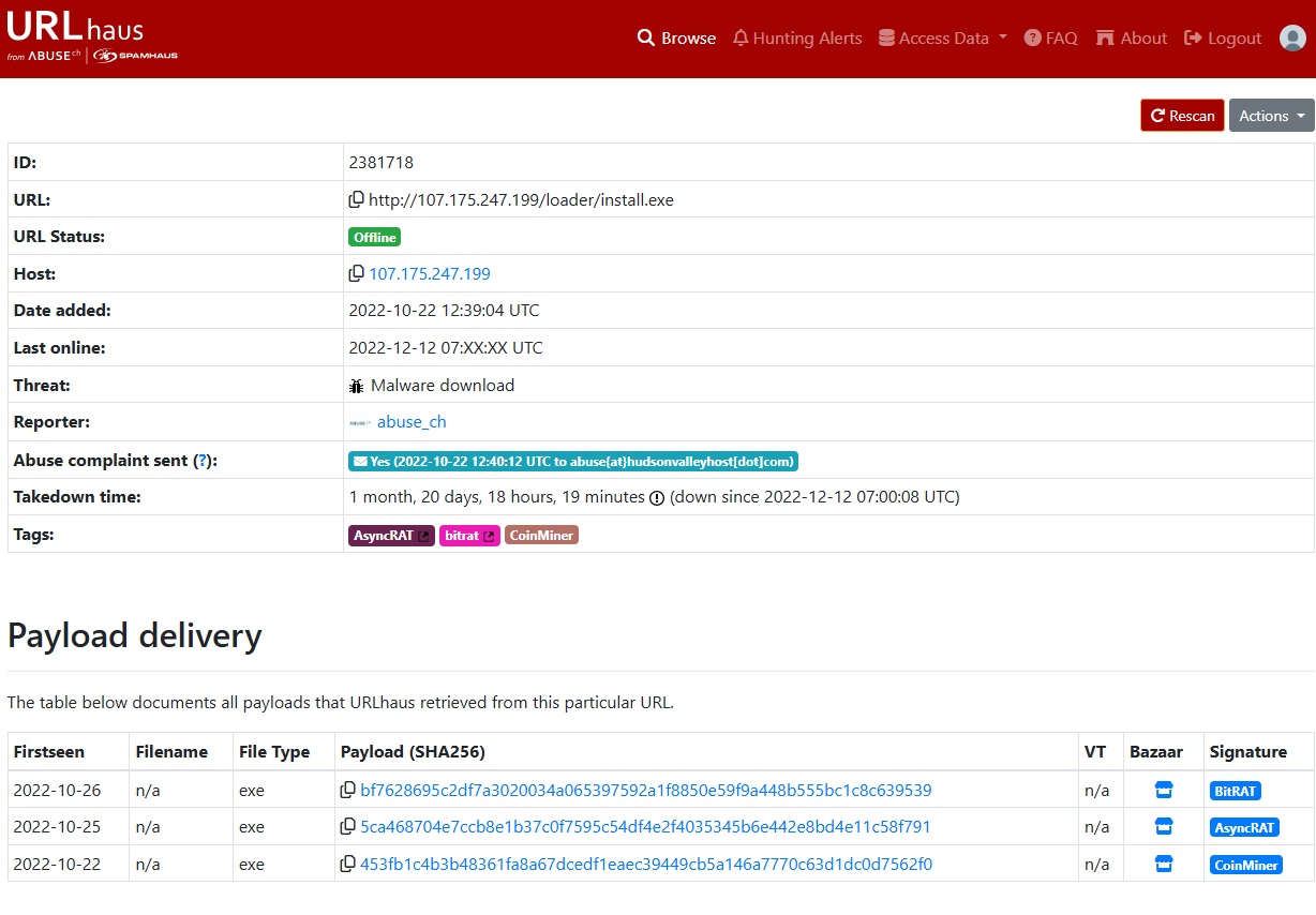 Querying the malicious URL in URLHaus reveals it has been flagged for malware distribution:
