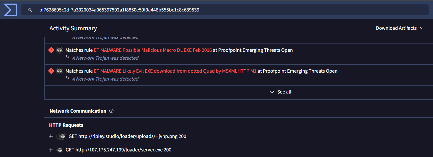 Analyzing this hash in VirusTotal reveals additional network communication: