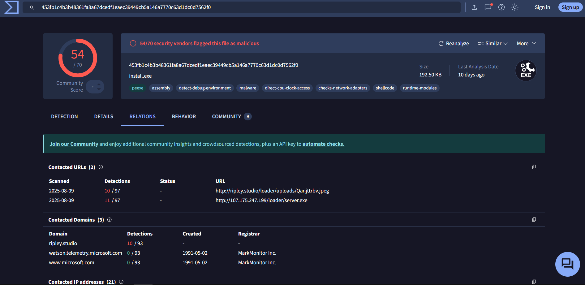 Analyzing this hash in VirusTotal provides detailed behavioral analysis: